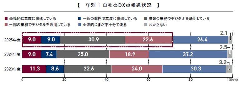 DXの推進(全社的に推進・一部の部門で推進)や、デジタル活用(複数業務で活用・一部の業務で活用)に取り組んでいる企業の割合は、2025年は全体の約7割を占め、これまでで最も高くなりました。急ピッチで進んでいるとは言い切れませんが、各企業がデジタル化の取り組みを進めている(進めざるを得なくなっている)ことがうかがえます。