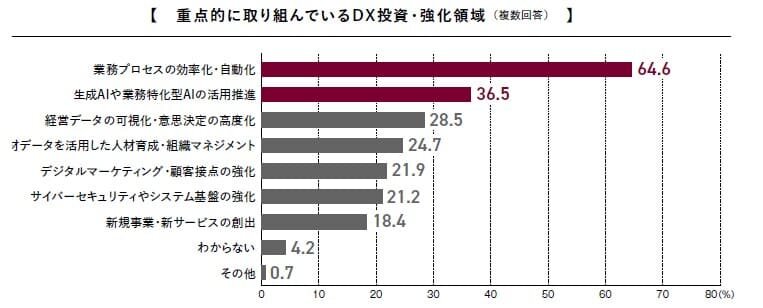 DXで重点的に取り組んでいる領域は、「業務プロセスの効率化・自動化」(64.6%)が最も多く、「生成AIや業務特化型AIの活用推進」(36.5%)が続きます。DX(デジタルトランスフォーメーション)という真の意味では、「新規事業・新サービスの創出」などを実現することが大きな目標ですが、実態としては「部分的に」「できるところから」のデジタル化から取り組んでいる企業が多いようです。