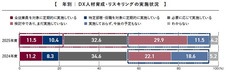 DX人材育成について、2024年から変わったのは、「検討中」が増加し、「予定もない」が減少したところです。その一方で、「全従業員を対象に定期的に実施している」(11.5%)と「特定部署・役職を対象に定期的に実施している」(10.4%)を合わせても約2割にとどまっていることは2024年からあまり変化がなく、まだまだ実施までには至っていないことがうかがえます。