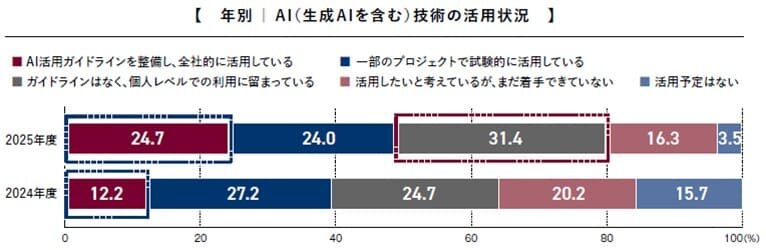 「AI活用ガイドラインを整備し、全社的に活用している」と答えた企業は24.7%で、前回2024年での12.2%からほぼ2倍に増えており、個人レベルでの活用から企業としての活用へと展開していることがうかがえます。技術の急速な進歩とともに、企業での利用も急速に増えると想定され、逆に活用しないことがリスク・遅れをとる原因になることも考えられると言えます。