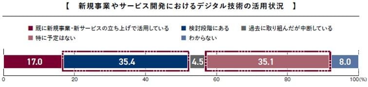 「既に新規事業・新サービスの立ち上げで活用している」は17.0%にとどまりました。DX(デジタルトランスフォーメーション)の文字通り、新規事業に発展させ、企業としての「変革(トランスフォーメーション)」にまで昇華できている企業はまだ少ないようです。新規事業の立ち上げは難易度が高いですが、実現すればまだまだ先行者利益を獲得できるとも言えます。