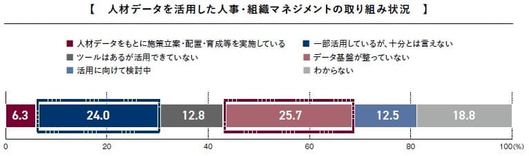 「人材データをもとに施策立案・配置・育成等を実施している」は6.3%にとどまり、「データ基盤が整っていない」(25.7%)が最も多い結果となりました。採用・育成・スキル・評価・報酬など、従業員1人に対してもたくさんの人事に関するデータがありますが、その性質上、一部の人しか持っておらず、企業としての活用ができていないという状況がうかがえます。人手不足や人材の流動化はどんな産業でも起きています。自社の人材が最大限に活躍し、「この会社にいてよかった」と思ってもらえるように、デジタル技術も活用した人的資本の価値最大化をする必要がありそうです。