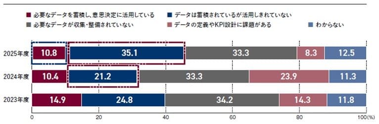 企業内のデータを蓄積・活用し、よりスピーディーに、より透明に、より精度の高い経営判断ができるようにすることが「マネジメントDX」です。アンケートの結果からは、「データは蓄積されているが活用しきれていない」が35.1%と最も多く、その割合が2023年・2024年と比べても増加しています。ノーコードツール活用のハードルが下がっていることや、基幹システムのリプレイスなどにより、データを蓄積する体制は整っているものの、それを活用するフェーズには至っていないことがうかがえます。