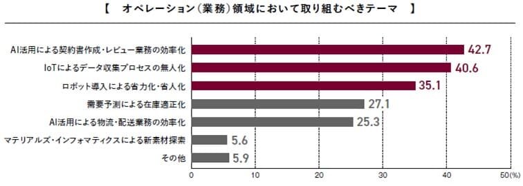 業務領域でのDXでは、「AI活用による契約書作成・レビュー業務の効率化」「IoTによるデータ収集プロセスの無人化」「ロボット導入による省力化・省人化」といった取り組みが上位に挙がりました。特定の業務に偏っているわけではないことから、企業ごとの事情や費用対効果など、それぞれ優先順位をつけて取り組んでいることが考えられます。