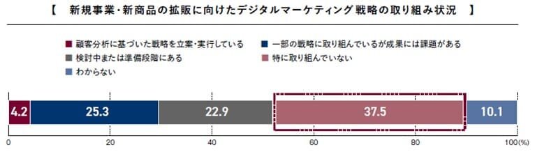 新規事業や新商品が開発できても、それを認知してもらい、お客様の購買意欲につなげなければなりません。こうした際にデジタルマーケティング戦略の有無やその巧拙がカギとなるのですが、アンケート結果ではデジタルマーケティング戦略に「特に取り組んでいない」と答えた企業が37.5%と最も多くなりました。逆に言えば、まだまだDX後発組にも挽回・逆転するチャンスがあると言えるでしょう。