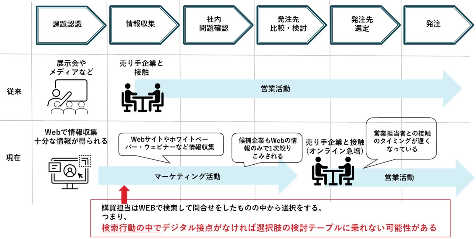 インターネットの普及により売り手との情報格差がなくなり、顧客はWebなどで情報収集し、ある程度意思決定が固まり候補を絞り込んだ状態ではじめてリアル接触を図るようになりました。初期段階で適切な情報を提供できなければ、選択肢にすら含まれません。