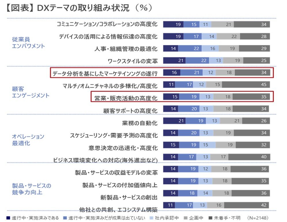 国内調査によると、データ分析に基づくマーケティングや営業活動の高度化に対して、約3分の2の企業が何らかの投資を検討しています。営業DXに取り組まない企業は、取り組んでいる企業と比べて競争力で大きく差をつけられてしまう状況です。