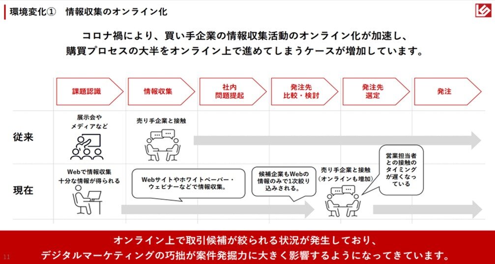 デジタル技術やAIの発展に拍車をかけるように、コロナ禍によって買い手企業のオンライン化がより一層加速し、情報収集だけではなく、企業選定に至るまで、購買プロセスの大半をオンライン上で進める動きが増える傾向が強まりました。つまり、オンライン上で買い手企業の目に留まらなければ、「競合がいる営業競争の土俵にすら立てない」という事態が一般的になりました。