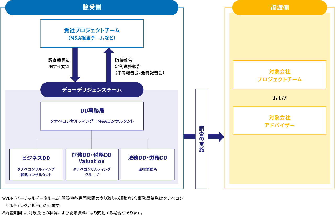 また、DD実施時の事務局業務(VDR作成、資料収集、インタビュー調整など)から、リスク検出事項の対応策まで検討いたします。