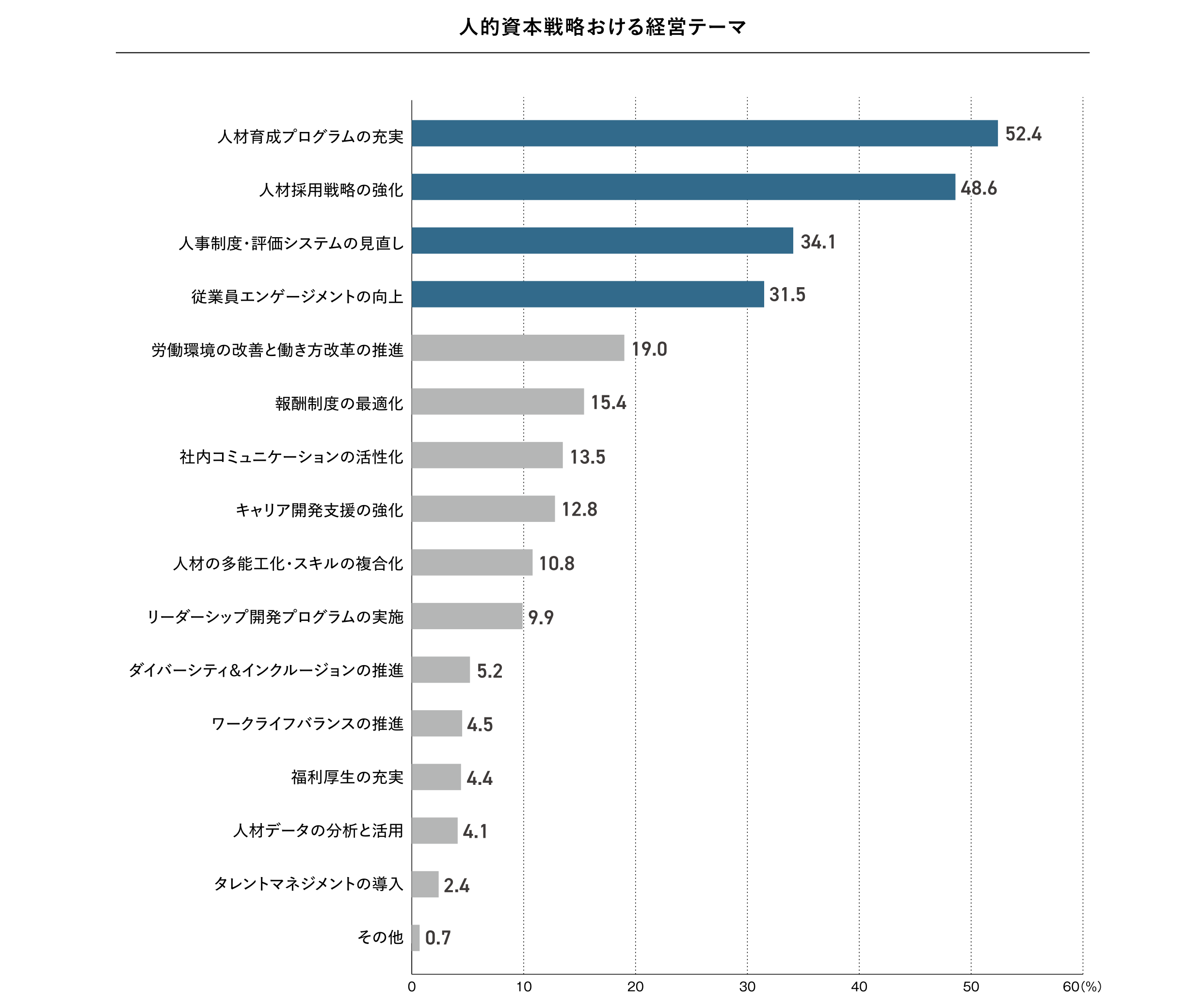 人的資本戦略における最優先テーマについて質問をしたところ、 人材採用強化やエンゲージメント向上よりも「人材育成プログラムの充実」と回答した企業が最も高く、競争優位を保つために"仕組み"としての人材育成が不可欠であるという認識が高まっています。改めて包括的かつ体系的な人材育成プログラムを充実させ、社員の継続的なマインドセット・スキルアップを図ることが重要です。(タナベコンサルティング 2025年度企業経営に関するアンケート調査 2024年11月6日~12月20日/有効回答 2021件)