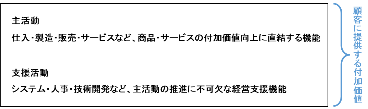 下記図のように、バリューチェーンは『主活動』と『支援活動』に大別できます。