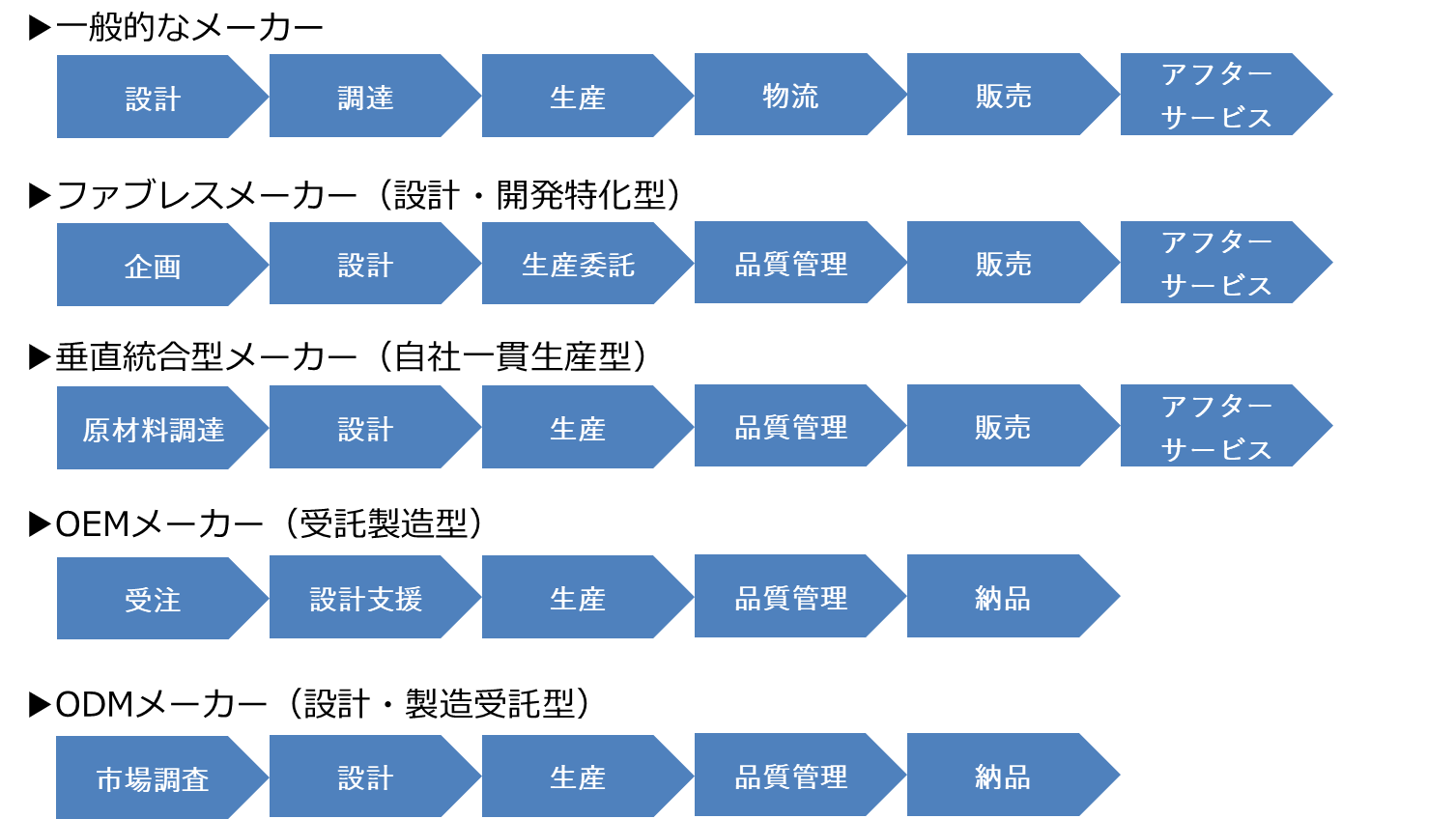 製造業とひとえに言っても、事業モデルによってそれぞれ特徴が異なります。まずは自社のバリューチェーンがどのような構造になっているのかを把握することが重要です。一般的な製造業の場合、設計→調達→生産→物流→販売→アフターサービスとなりますが、企業によっても異なる為、自社にとってのバリューチェーンを考えることが肝要です。