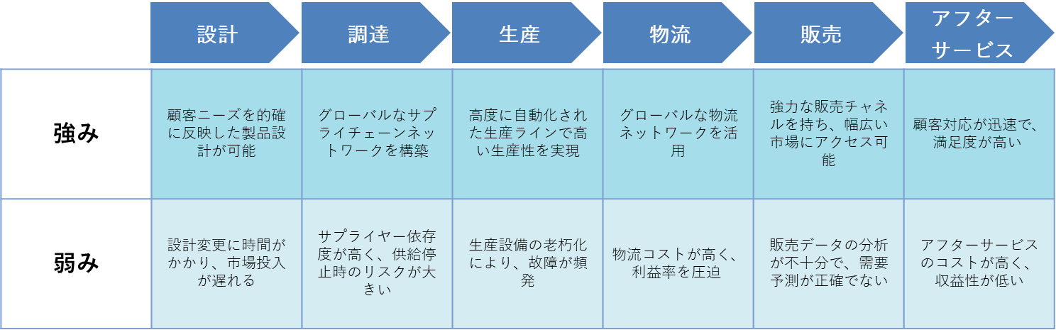 各バリューチェーンにおける自社の強みと弱みを分類していきます。この時点では自社のみを捉えた視点で可能な限り多くの項目を列挙していくことがポイントです。
