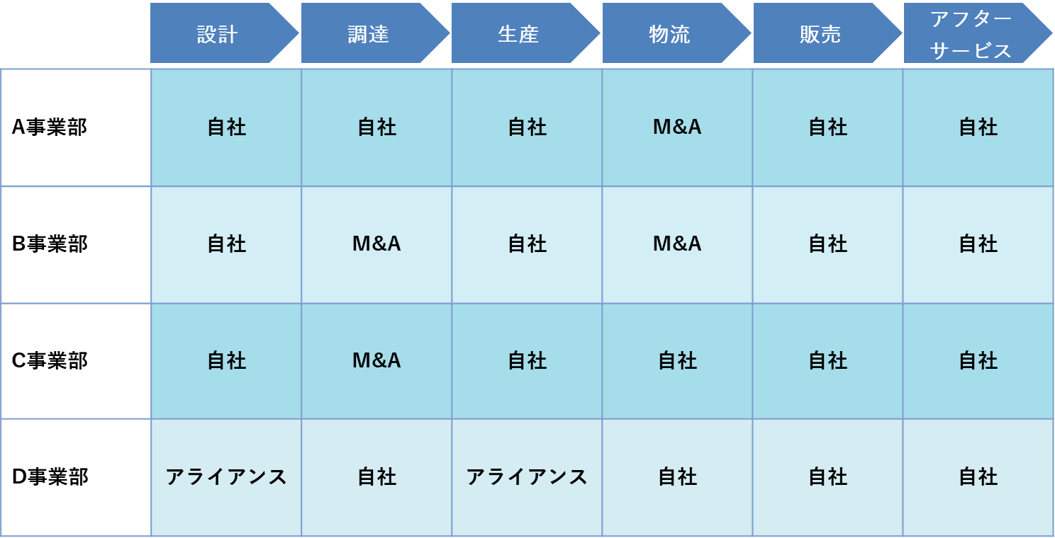分析を終えたら、戦略の立案を進めていきます。分析結果を基に競合他社との差別化戦略を策定していきます。まずは自社の強みを最大化し、競争優位性を確立するための具体的な戦略を定めていきます。事業部毎に自社で行うべき領域、アライアンスで補完する領域、M&Aで強化する領域を整理します。自社の強みはそのまま活かし、弱みを補う為に部分的な外部リソースを活用することで、効率的な事業運営が可能となります。
