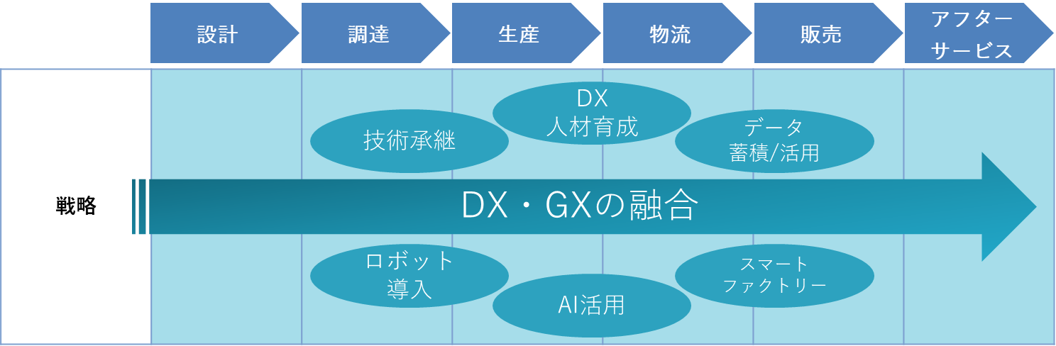 次に、外部環境の変化から市場を捉え、具体的な戦略に落とし込んでいきます。現在の製造業において求められている戦略として『人材育成の取り組み』と『デジタル技術の活用』が大きく挙げられています。製造業の持続的成長には、デジタル技術や成長分野に対応した人材育成が不可欠であり、人的資本経営への取り組みが年々加速しています。DX(デジタルトランスフォーメーション)の推進は製造業の稼ぐ力向上や脱炭素(GX)の推進に寄与する重要な取り組みであり、データやデジタル技術の活用によるサプライチェーンの強靭化や事業効率の向上が期待されています。労働力不足への対応として、ロボットやAIの活用も推進されている為、バリューチェーンの中でいかに活用するかが鍵となります。