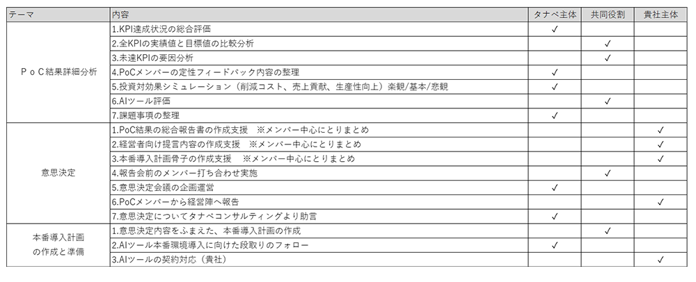 単なるツール検証に留まらず、現場社員の成功体験創出を重視し、実業務での活用可能性を徹底検証します。活動を通じて得られた定量・定性データや課題は「PoCレポート」としてまとめ、実用性の高い「プロンプト集(Ver.1.0)」の作成まで行います。