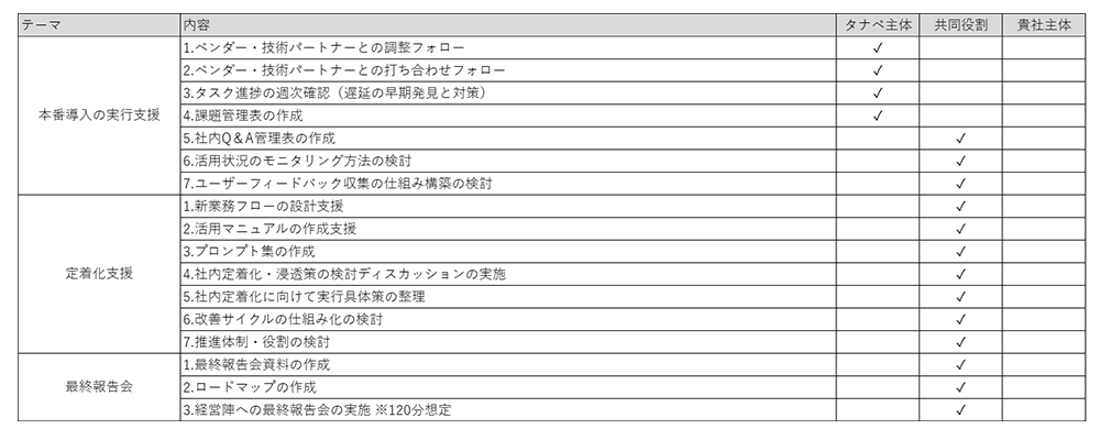 実データを用いたPoCを実行し、現場での定着を支援します。週次定例会を通じた進捗管理に加え、メンバーへの操作教育やプロンプト最適化のアドバイスを実施し、リテラシー向上を促進します。