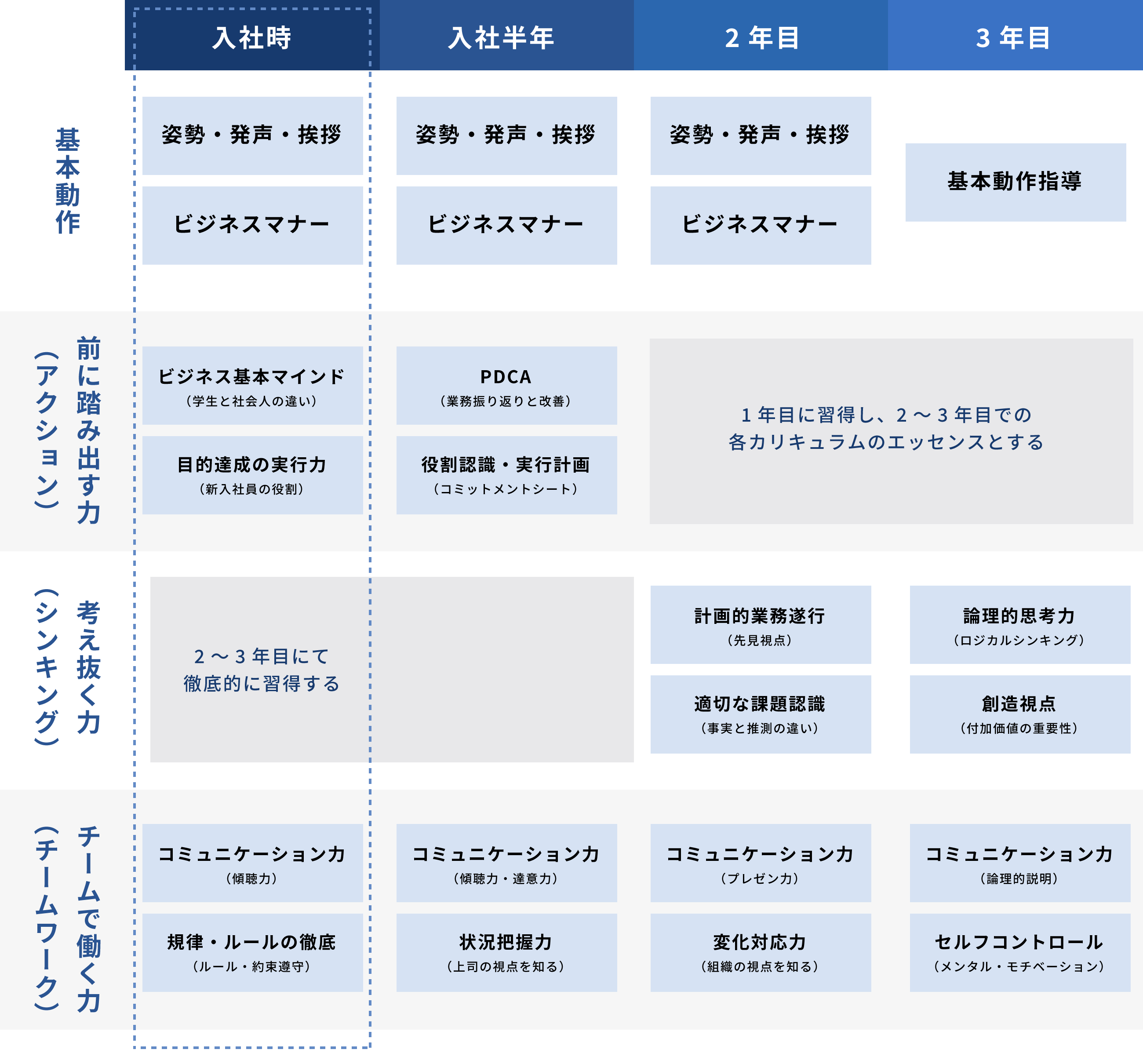 3年での育成・活躍・定着を目指し、3年目までの育成計画の策定から研修プログラムの実施を通じ、 社会人としての基本姿勢・ビジネスにおける基本動作の確実な体得を実現します。